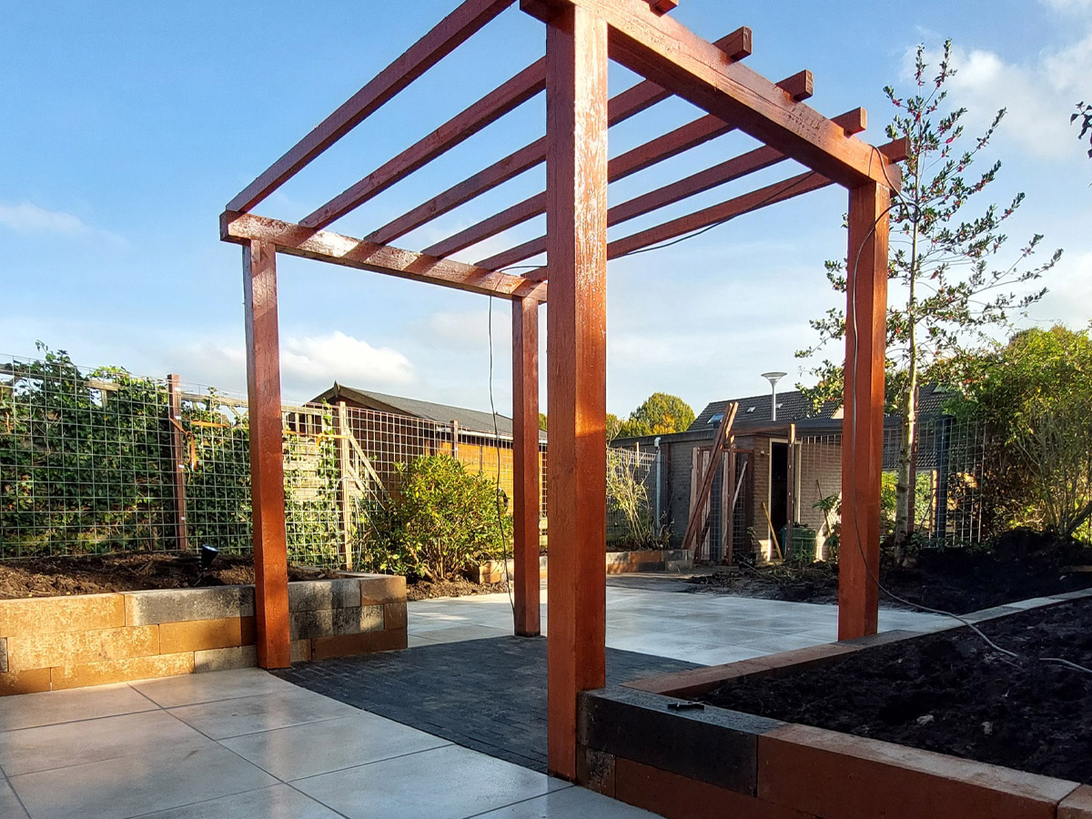 Wij ontwerpen en bouwen uw overkapping, tuinhuis of pergola volledig op maat. Met een focus op duurzaam Douglas hout en een degelijke constructie, creëren we een functioneel en sfeervol buitenverblijf dat perfect bij uw tuin past.